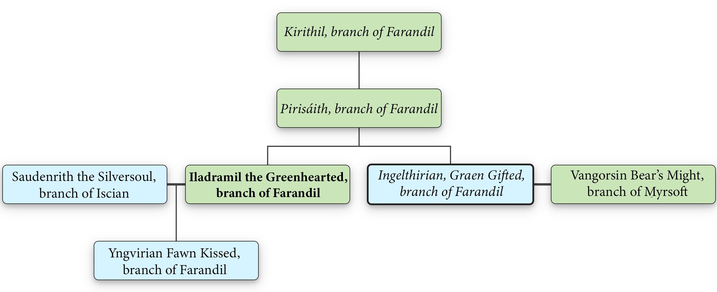 For simplicity, only individuals who are mentioned by name within The Last Days of Farandil are included within the geneaology diagram.