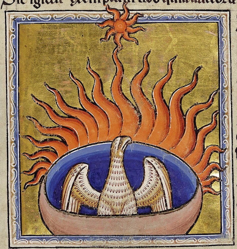 No small surprise then, that a bird claimed to be gifted with the powers of resurrection, detailed in a treatise by a Christian sect, might work its way into the Christian mainstream. In his collection of works on the Phoenix, scholar of Middle English literature Norman Blake points us toward a passage from the Exeter Book, one of the largest extant collections of Old English poetry. Within we find one of the many medieval connections made between Christ and the phoenix. We are told not only that the bird is “much like the chosen servants of Christ,” but also that of this bird “the fire devours the frail body… then flesh and bones the pile’s flame burns,” before the bird once more “becomes large, all renewed, born again, sundered from sins.” It’s argued that the poem not only uses the phoenix as a symbol to represent Christ, but also to represent all Christians, enduring the fiery judgement of the apocalypse.